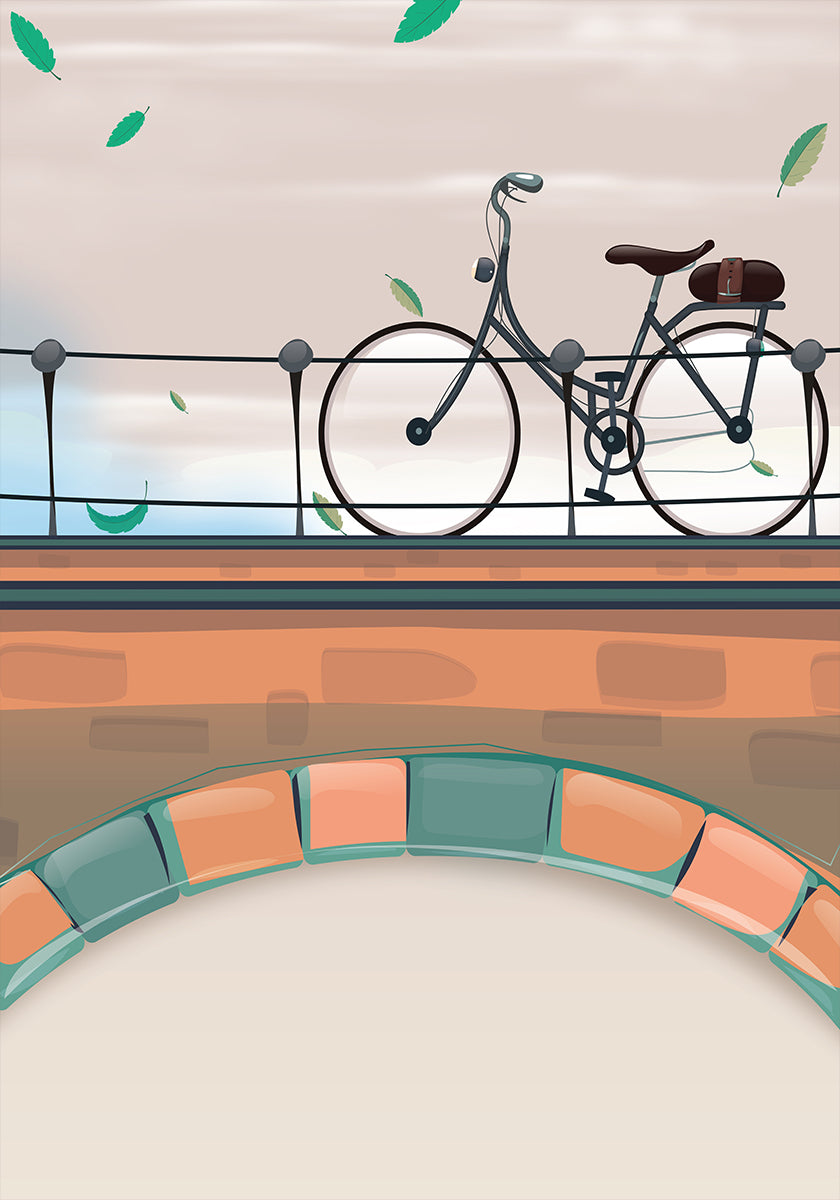 Ein stimmungsvolles Amsterdam-Poster, auf dem ein ruhiger Kanal die ikonischen schmalen Giebelhäuser der Stadt widerspiegelt. Ein Radfahrer gleitet über eine elegante Brücke, umgeben von grünen Bäumen und sanften Herbstfarben. Die klare, grafische Komposition fängt den Rhythmus, die Poesie und die Freiheit der Stadt ein. Illustration von Nicholas, perfekt für Liebhaber von Fahrrädern, Kanälen und klassischem urbanem Charme.