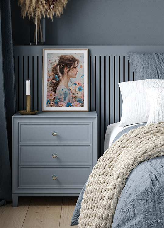 Ein verträumtes Aquarellkunstwerk einer heiteren jungen Frau, umgeben von blühenden Blumen in Pastellfarben. Die zarten Schmetterlinge und schwebenden Blätter vermitteln ein Gefühl der Ruhe und Kontemplation und eignen sich perfekt, um eine harmonische und inspirierende Atmosphäre zu schaffen.